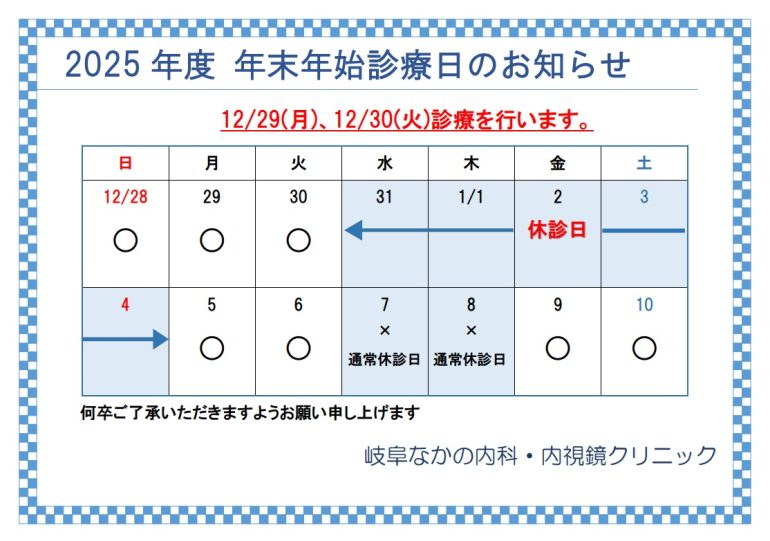 2024年度 年末年始の診療日のお知らせ(12/29(日)、12/30(月)、12/31(火)も診療を行います)